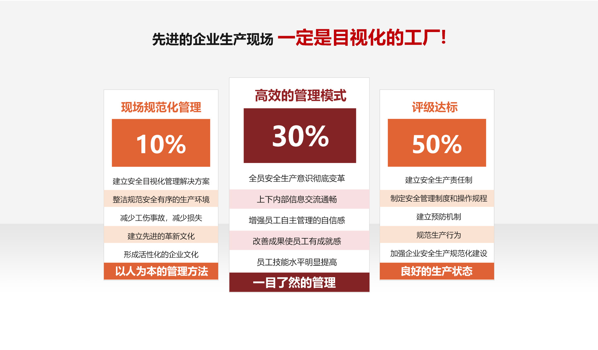 华泰安全目视化管理以安全法律、法规、标准和危害识别风险评价为基础,运用标识警示、6S管理、看板管理、定置管理等方法,结合企业VI、生产的特点、安全管理现状,将各方内容融合,策划一套系统的安全目视化管理解决方案。
