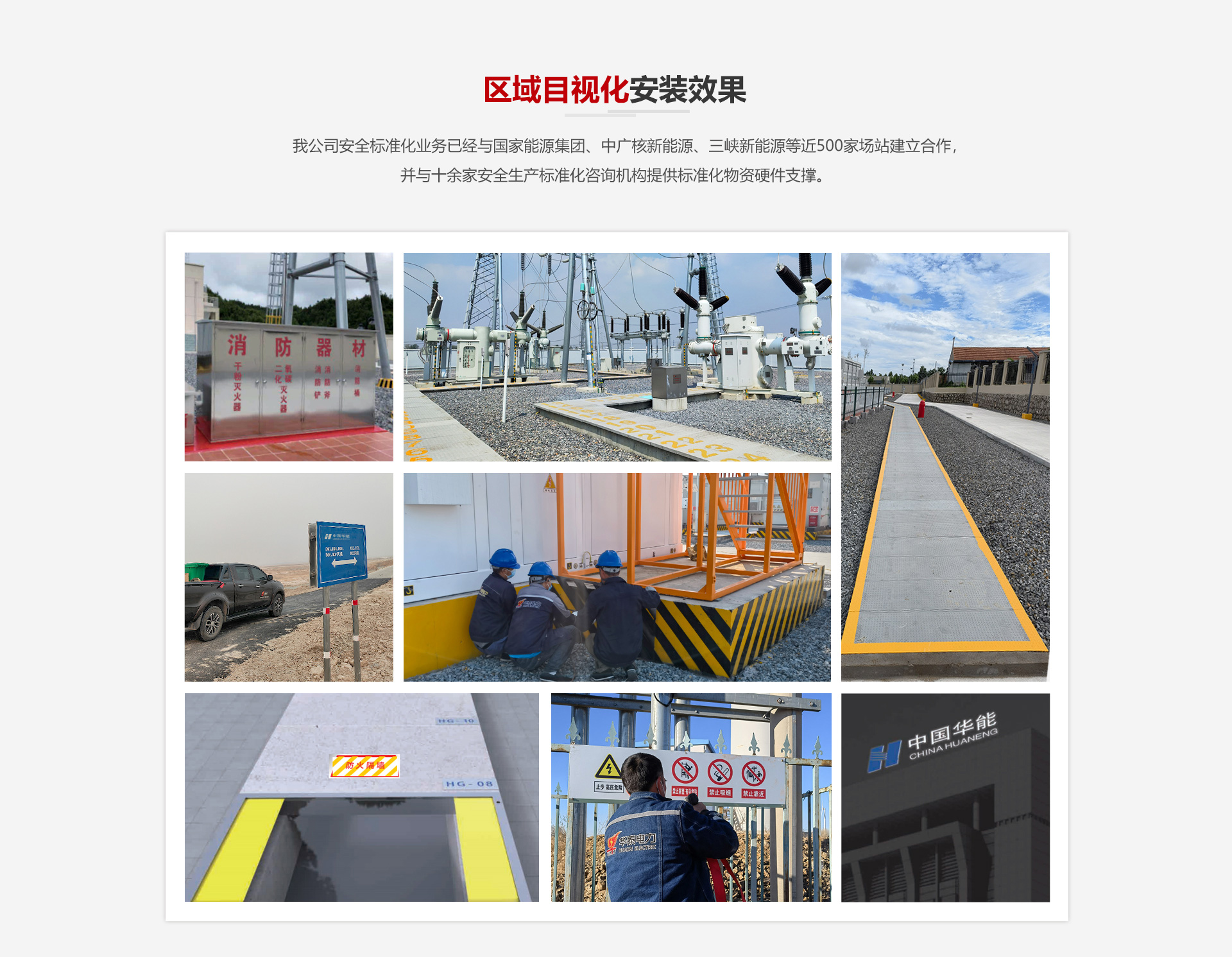我公司安全标准化业务已经与国家能源集团、中广核新能源、三峡新能源等近500家场站建立合作,并与十余家安全生产标准化咨询机构提供标准化物资硬件支撑。